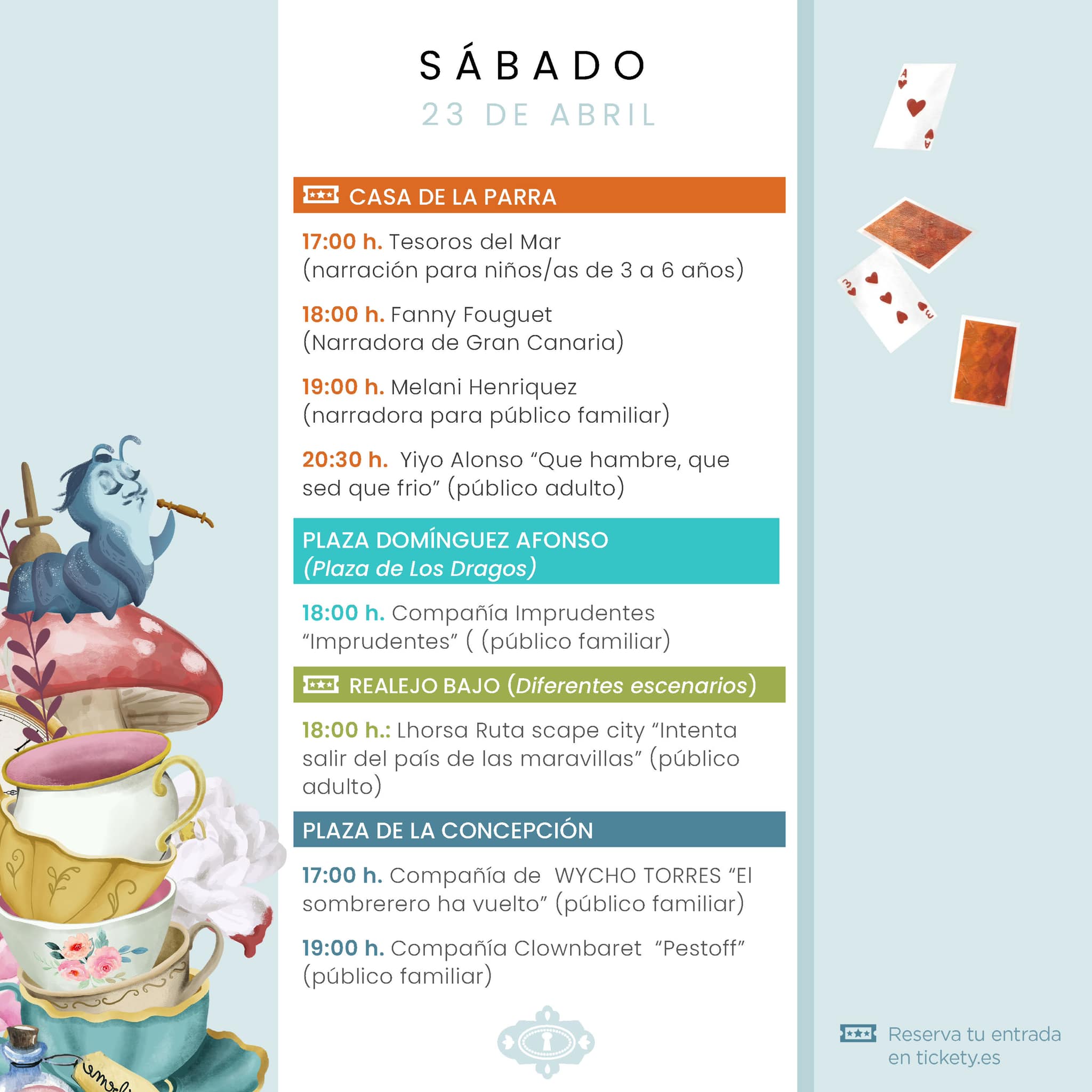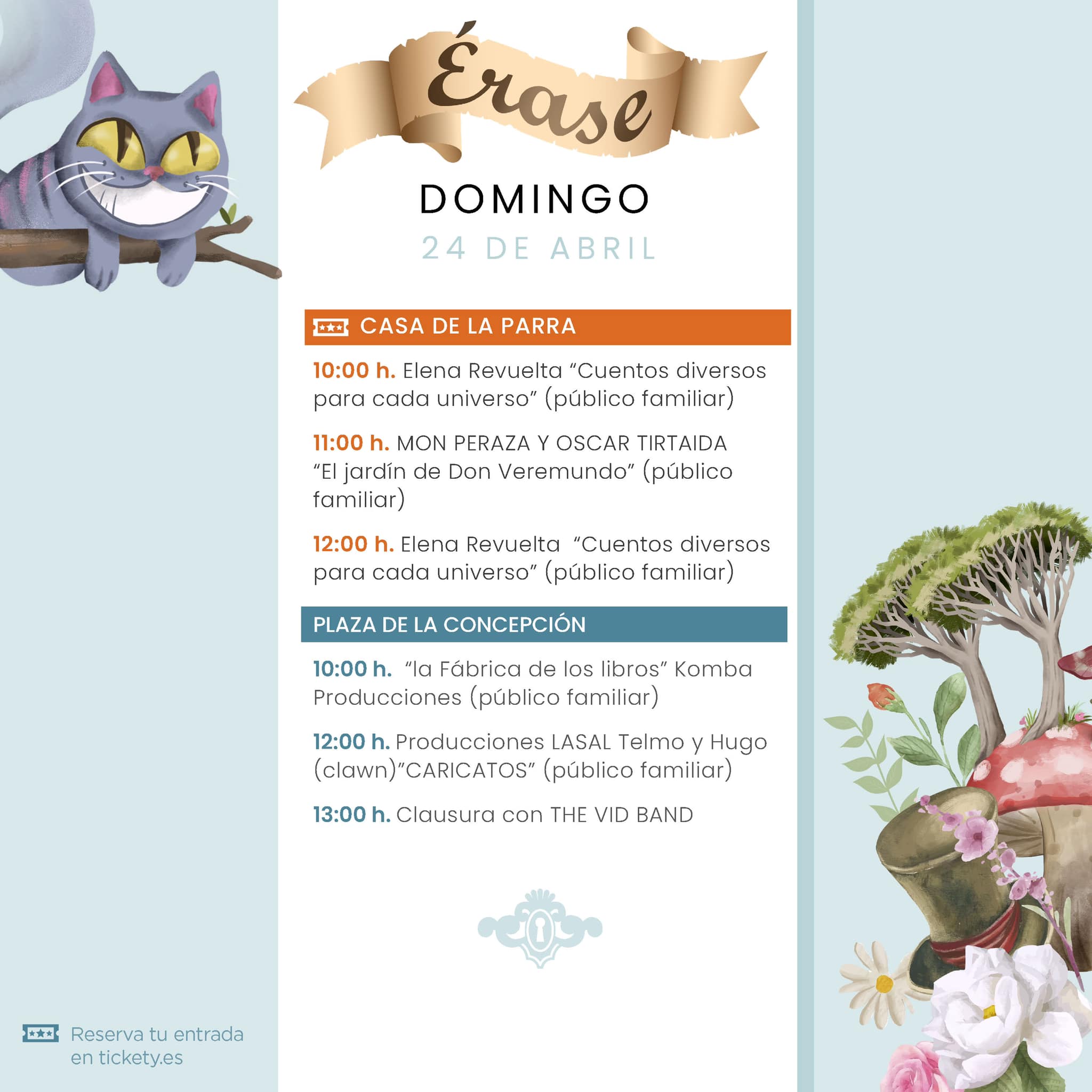 Las actividades en la calle y plazas serán de libre acceso, y las de interior en la Casa de la Parra con aforo limitado y tickets. Desde ayer, miércoles 20 de abril está habilitada la taquilla electrónica para hacer tus reservas. Tic, tac…