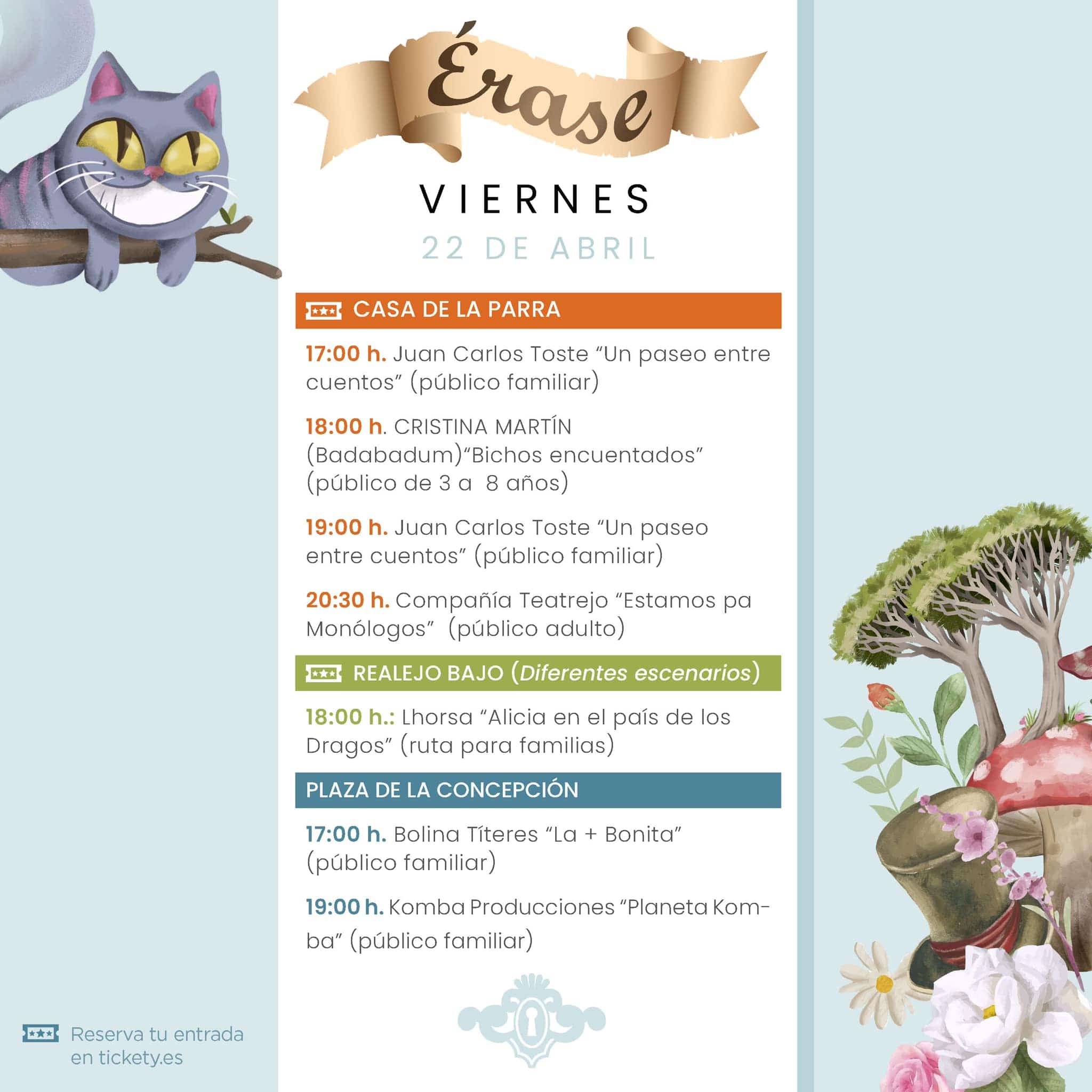 Compañías teatrales, espectáculos artísticos, talleres, sesiones de narración y un amplio programa que girará en torno a «Alicia y el País de las Maravillas», serán los ingredientes que conformarán este evento #Érase, organizado para los días 22, 23 y 24 de abril y cuya programación se desarrollará por varias zonas y edificios emblemáticos del municipio.